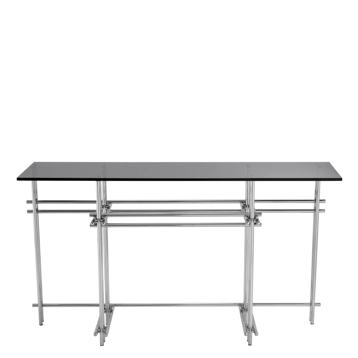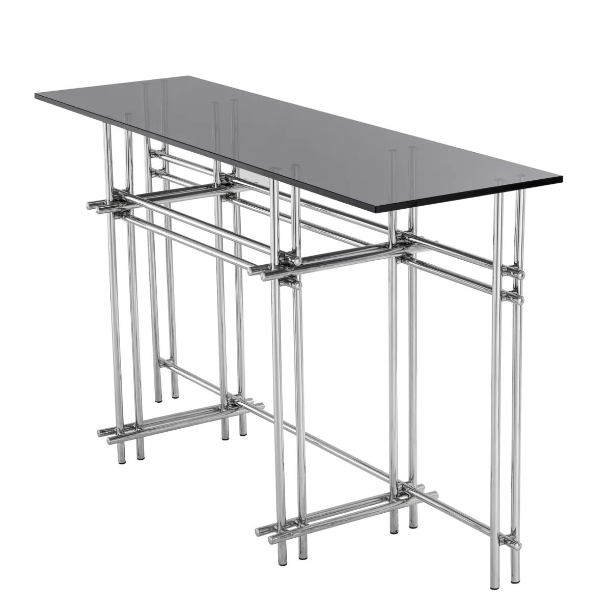 Sa base robuste en acier inoxydable poli est formée par un jeu de barres intrigant. Avec un plateau chic en verre couleur fumée, cette console élégante donnera à tout espace intérieur luxueux une touche de décadence et de design. Associez-la au miroir Quinn en acier inoxydable poli.